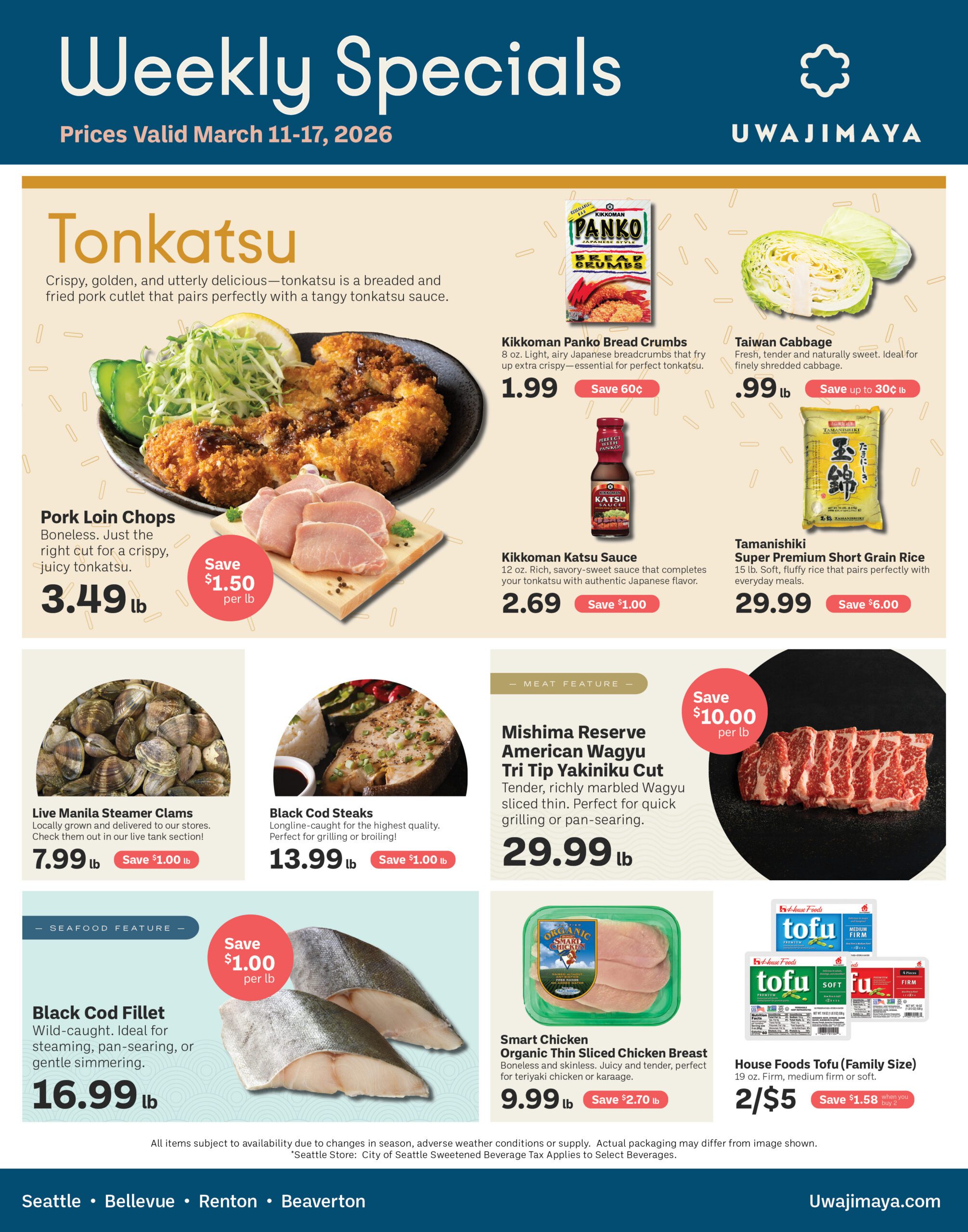 Weekly Specials See what’s on special this week! Download PDF Right Follow Along on Our Instagram! @uwajimaya Mark your calendars 📅 Limited edition Uwajimaya ho Our Uwajimaya meals are available all day, but the Crispy, golden tonkatsu for dinner tonight? Yes pl It’s Mapo Tofu Week! Turn up the heat with this b Yum! Yum! Yum! Related Recipes View All Recipes Right Chinese Hot Pot November 3, 2025 Japanese Tartar Sauce February 6, 2025 SPAM Rice Crispy Treats SPAM Sliders We Believe a Team of Individuals with Diverse Backgrounds and Experiences Working Together Powers Our Success. Apply Now Right